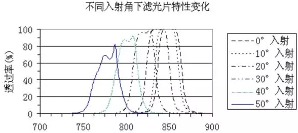 如果入射光線與濾光片的法線夾角有一定范圍,那么要指明這個(gè)夾角的具體范圍,因?yàn)楦缮鏋V光片的設(shè)計(jì)對(duì)角度十分敏~感,對(duì)于0°下設(shè)計(jì)的窄帶濾光片,如果在不同角度下使用,其效果是完全不同的。圖3是以850nm窄帶濾光片為例,當(dāng)入射角度增大時(shí),中心波長(zhǎng)的位置不斷向短波移動(dòng)。只要是干涉濾光片,這個(gè)角度效應(yīng)無法避免,這是干涉濾光片的基本特性。從圖中可以看出,當(dāng)一個(gè)850nm的窄帶濾光片在50°下使用時(shí),它不再是一個(gè)850nm的窄帶濾光片,而變成了770nm的窄帶濾光片。有些用戶會(huì)反映,在用廣角鏡頭拍攝物體時(shí),加了窄帶濾光片后,發(fā)現(xiàn)只能拍到中間部分的物體,邊上的都很暗,以為窄帶濾光片只有中間透,邊緣不透,這種認(rèn)識(shí)是不對(duì)的,窄帶濾光片整個(gè)表面都是均勻的,主要還是因?yàn)榇蠼嵌热肷鋾r(shí),濾光片的透光波段向短波移了,而短波部分又沒有光源造成的。